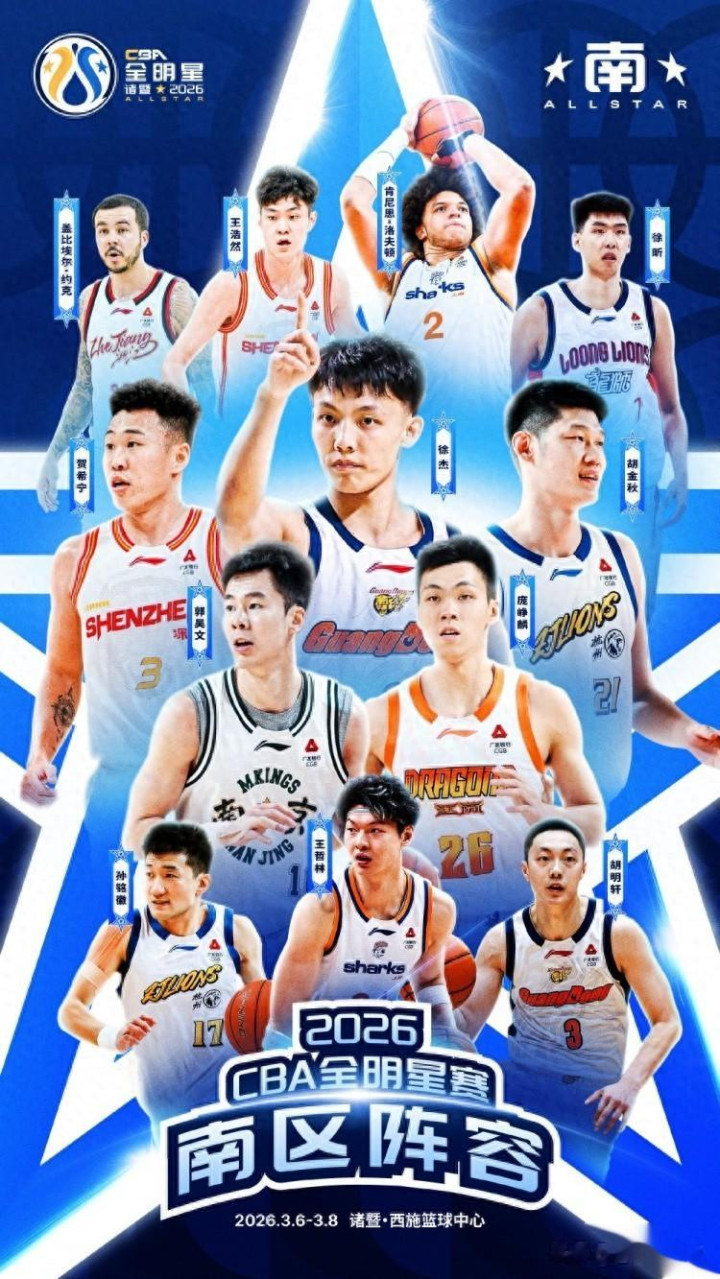 根据昨晚深夜CBA官方公布的2026全明星南北区全阵容名单显示,总共有24名球员入选,徐杰赵睿分别成为南北区的票王领衔出战,因为之前CBA公布了南北区的首发名单,这次是加上替补的,所以是完整阵容,有点惊喜的是原广东队的替补中锋徐昕,这个赛季租借去了广州龙狮后,现在第一次进入了全明星南区替补,这是一个跨越啊,以后打得好,首发也有可能,有点可惜的是之前的票王胡明轩这次也在南区的替补名单中,没办法,他这赛季状态不咋地,所以首发不了,但这依旧不能阻挡小胡的人气。